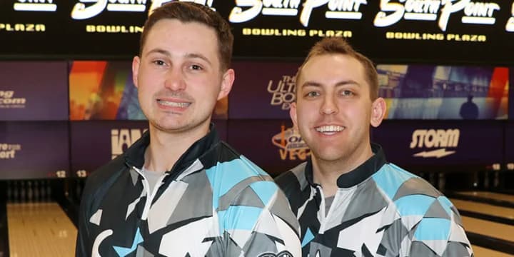 Kyle Damon, left, and Kyle Krol, right, grabbed the doubles lead Saturday at the 2022 USBC Open Championships. Photo by USBC.
