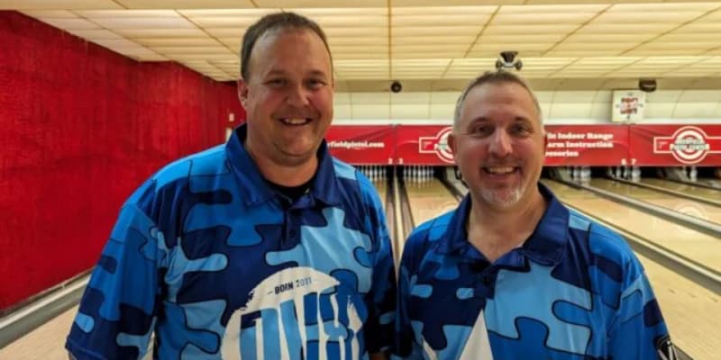Chad Maas, left, and Dave Beres, right, after winning the MAST doubles at Lake Ripley Lanes on Saturday. Photo by MAST.