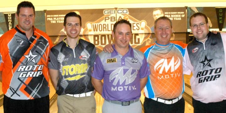 The TV finalists for the PBA World Championship in order from left to right: Wes Malott, Mike Fagan, Ronnie Russell, Todd Book and Stuart Williams. Photo by Pro Bowlers Association.