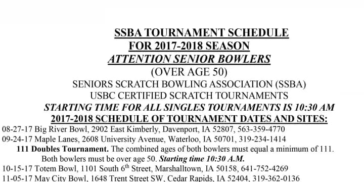The Senior Scratch Bowling Association of Iowa has released its 2017-18 schedule.